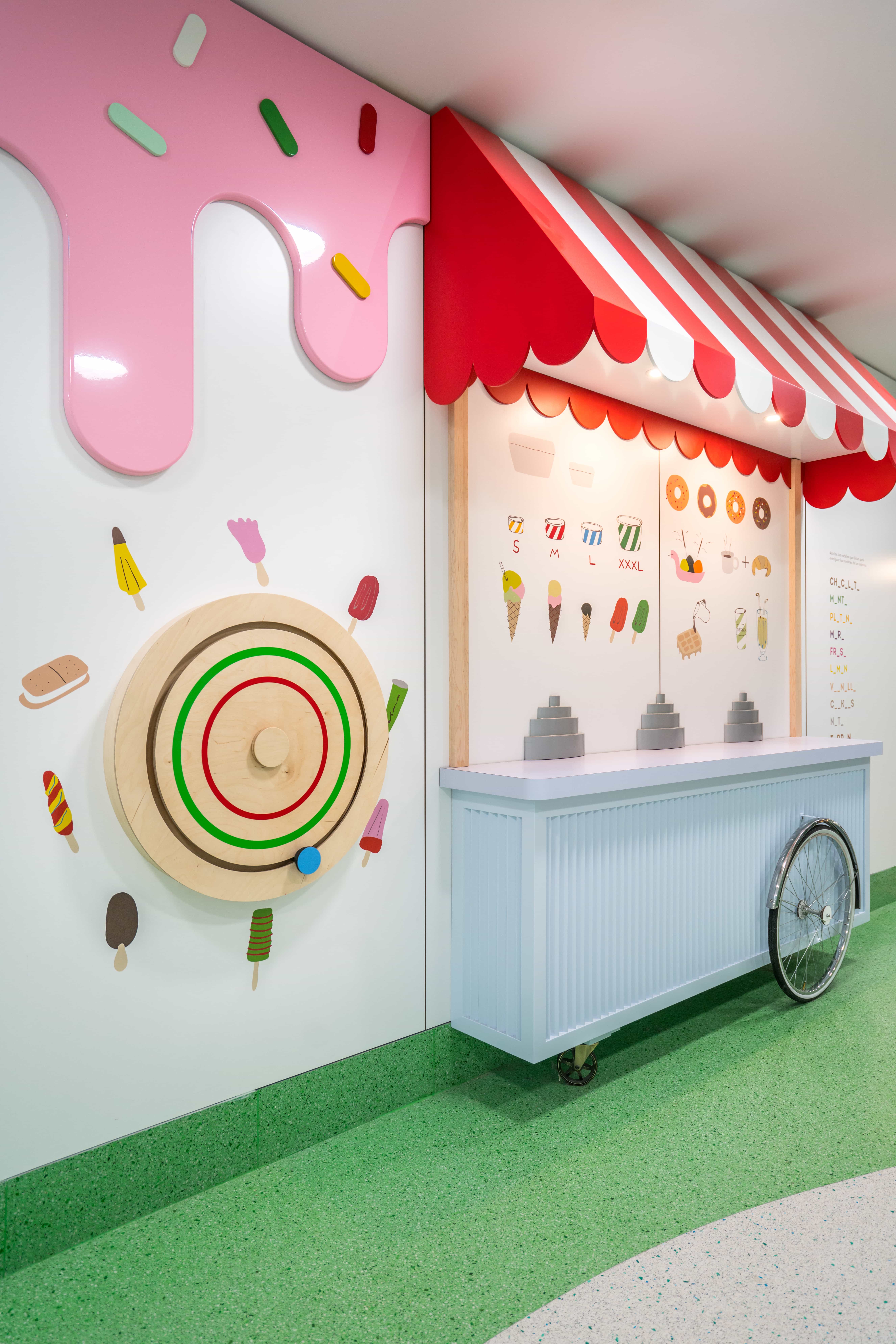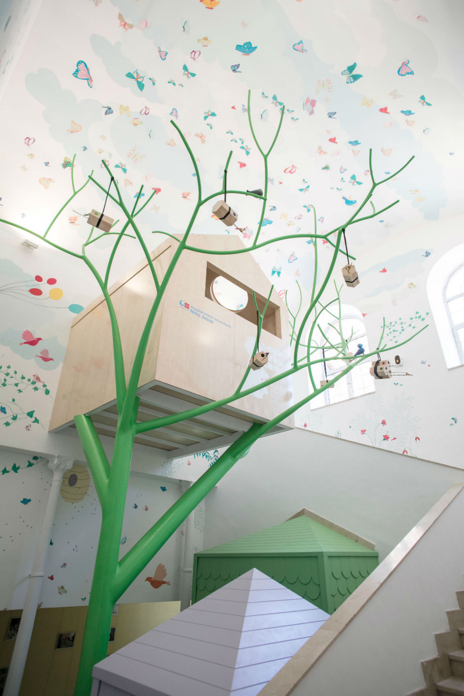 J.F: La idea surge de la localización del hospital. Se encuentra a escasos metros del parque del Retiro, tan solo una calle separa a los niños hospitalizados del parque, pero esa calle es insalvable para ellos. De ahí la idea de que si los niños no podían ir al Retiro, el Retiro entraría en el hospital. Cada año se han ido acometiendo distintas zonas, desde las zonas comunes, las salas de hospitalización, radiología, etc.