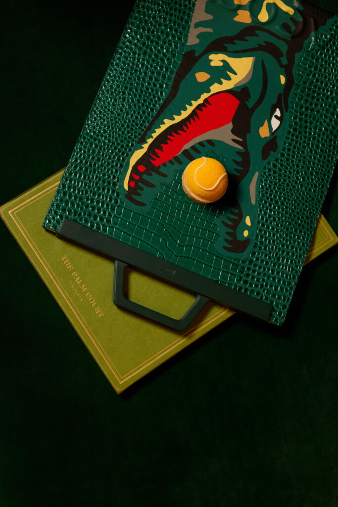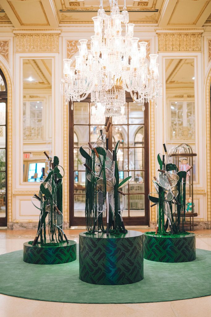 La famosa cúpula de vidrieras del Palm Court brillaba con el característico verde Lacoste, creando el escenario perfecto para una elegante reunión. Una escultura hecha a medida con raquetas vintage originales y tejido piqué, el mismo tejido que René Lacoste utilizó por primera vez para el icónico polo, presidía el espacio, rindiendo un llamativo homenaje al legado de la marca. La música seleccionada para la ocasión transportó a los invitados a la energía de un asiento junto a la pista.