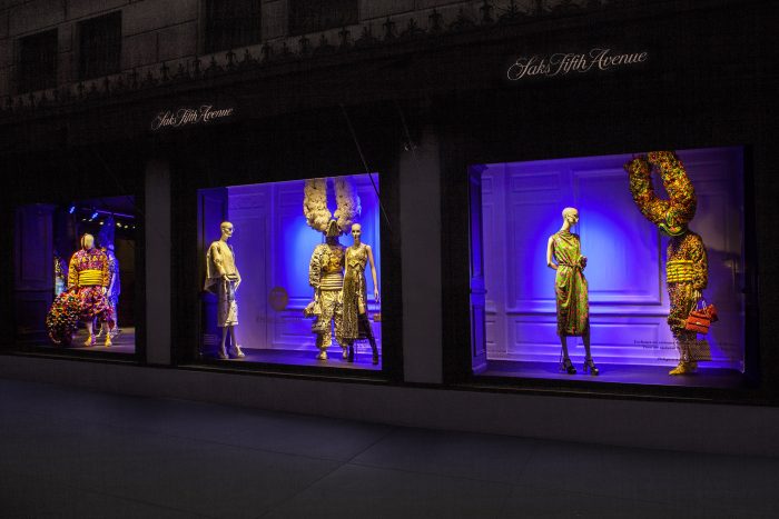 Las vitrinas de la exclusiva tienda Saks Fifth Avenue se engalanaron con la identidad carnavalesca dominicana, mezclada con las sofisticadas piezas en la tienda.