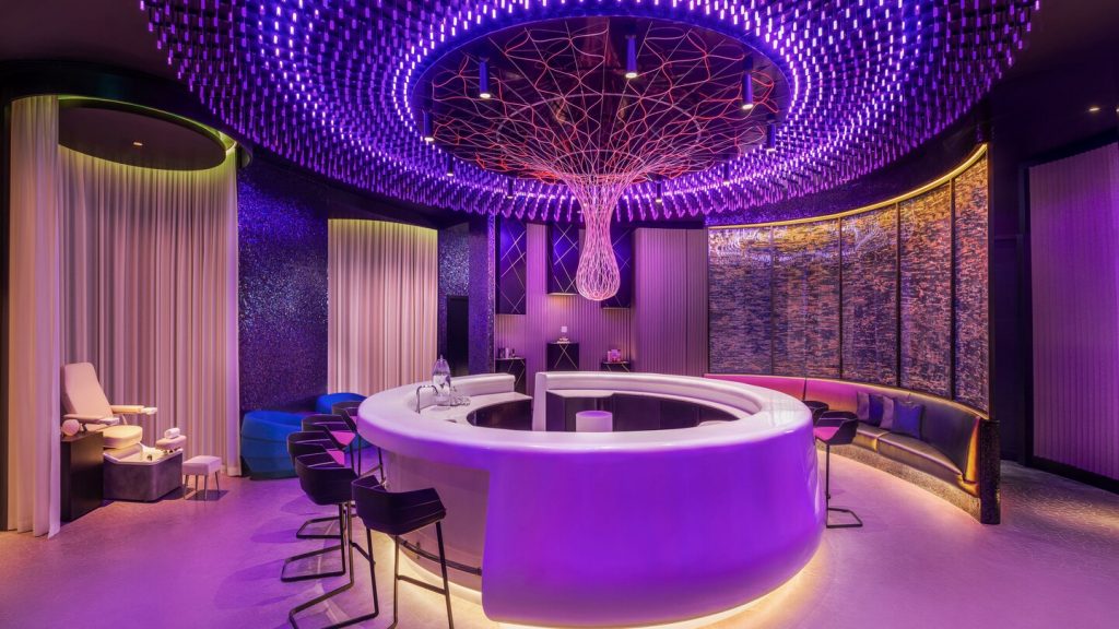 El exclusivo spa AWAY® de la marca W invita a los huéspedes a «Pasear y relajarse», ofrece diez salas de tratamiento, una sala de vapor, sauna, duchas experienciales, un hammam y una suite para parejas. Los huéspedes disfrutan de un diseño inspirado en la perspectiva submarina de un buceador de perlas, donde las conchas reflejan la luz del sol que se asoma por el océano. Relajante, social y surrealista, el espacio también cuenta con un Beauty Bar para retoques y tratamientos «Quick Fix».